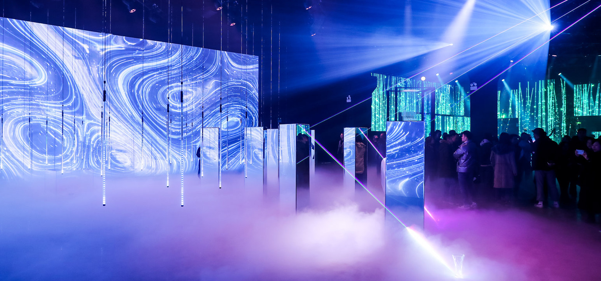 Eidetic took on this monumental mission of taking the event where every year the objective of the event is to show newly launched technology to target audiences effectively, and then combine that style of demonstration with an art exhibition successfully. We added the artistic atmosphere by separating the space into 4 seasons, with a day and night cycle. In the spring zone, the bamboo forest represented growth, lotus leaves floating on an LED screen pond and an LED waterfall with boats installed represented summer; in autumn, there was a yellow tent, parted open to reveal projections of poetic phrases; and the winter displayed vivid images of ice, snow, blizzards and icicles, with moving LED strips and laser emphasis.